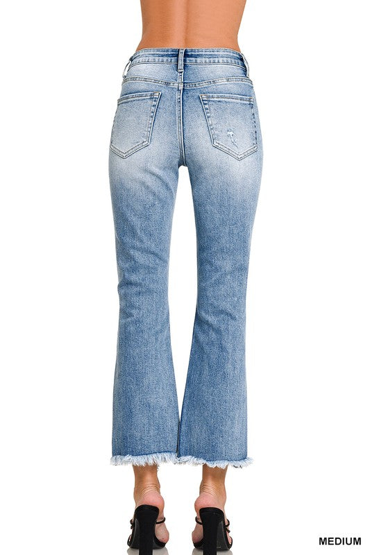 HIGH RISE STRAIGHT RAW HEM CROPPED DENIM PANTS - STRETCH - DISTRESSED FRONT RISE: 10.5 ", INSEAM: 27" approx. LEG OPENING: 16.25" approx. MODEL IS 5'9" WEARING SIZE 26 ** COLOR MAY VARY SLIGHTLY DUE TO MONITOR RESOLUTION