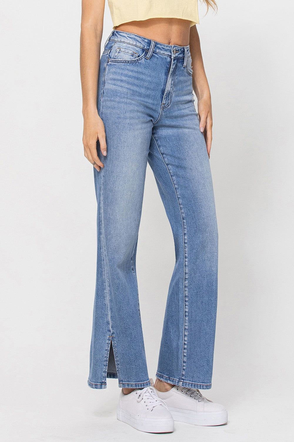Comfort stretch. 32” inseam. Wide straight leg with slit detail